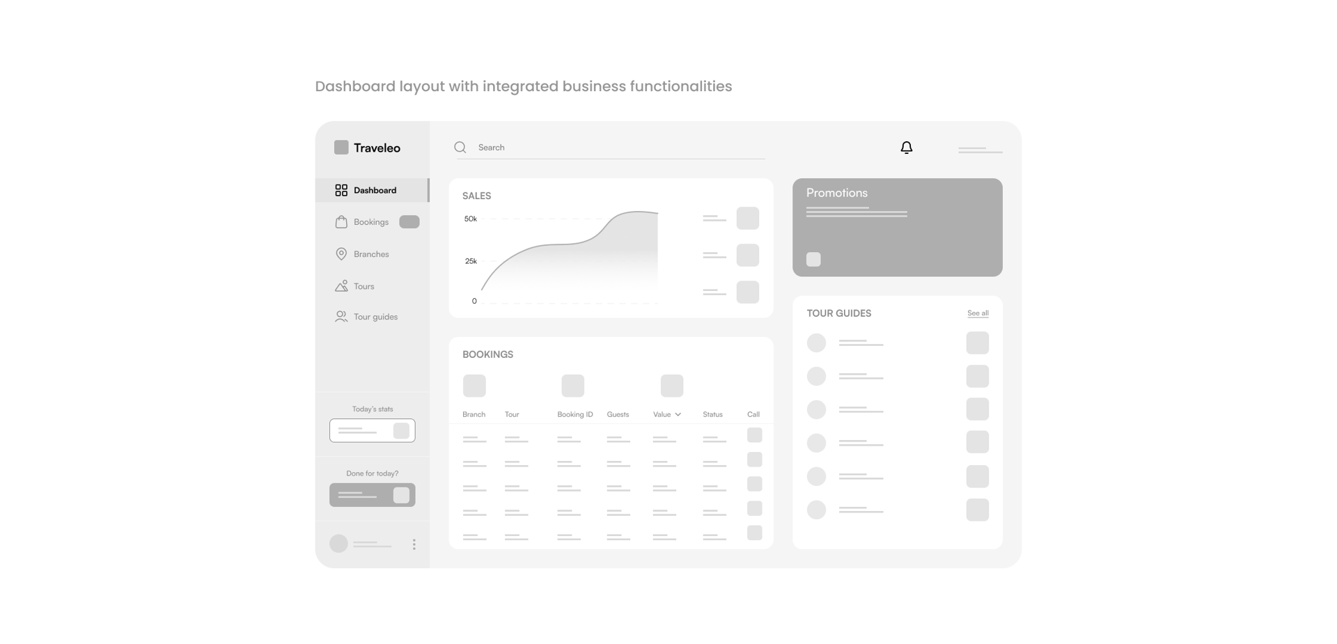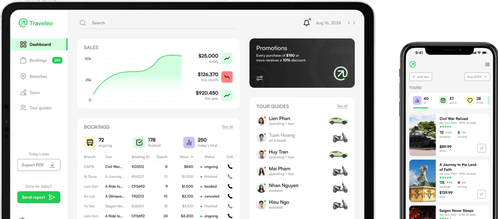 The dashboard informs the current sales, all the active bookings & data related to them, as well as the current promotion & active tour guides.